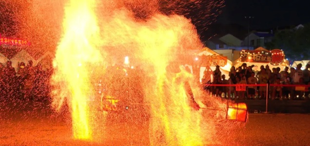 晚上7点30分,在佛堂镇小六石村的“浮生嘉年华”现场,火壶表演者龙卓身着防火服,手持带有两个铁框的木棒,在摇晃过程中,铁框里的木炭相互碰撞,形成璀璨的摇曳火光。
