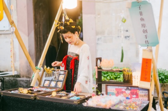 趁着傍晚开始消散的暑气,可以来逛一逛,购买饰品、文创,还有漆扇体验、手绘,感受穿越千年的烟火气吧!