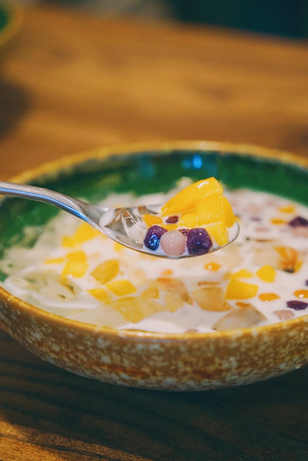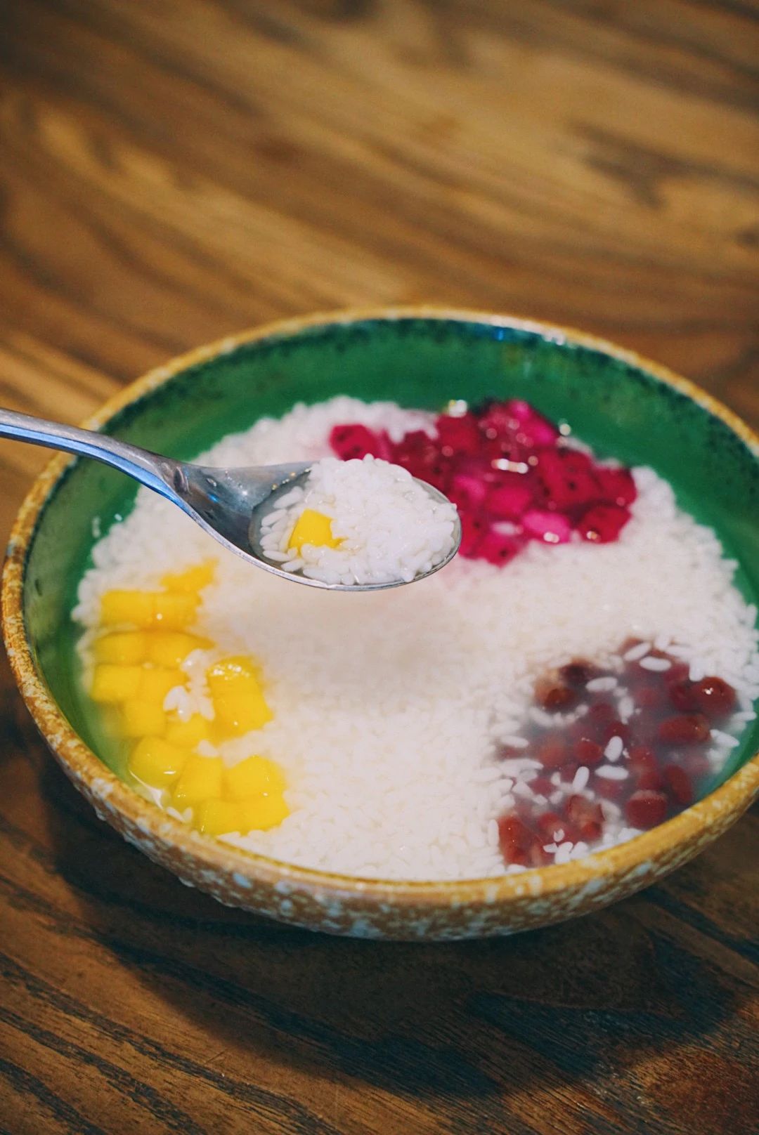 甜糯的酒酿裹着脆甜的西瓜、多汁的芒果,再添几颗晶莹芋圆,被游客称为“神仙组合”。