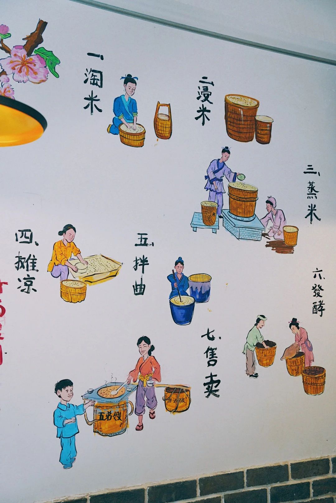 吴凡在店里墙上,展示着四代人的故事、酒酿制作流程插画介绍。
