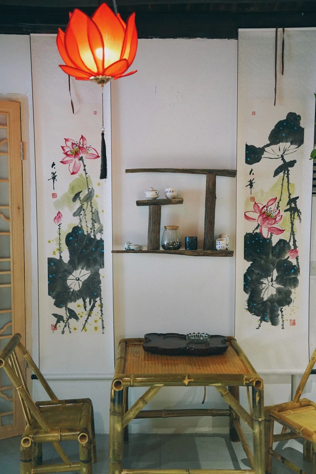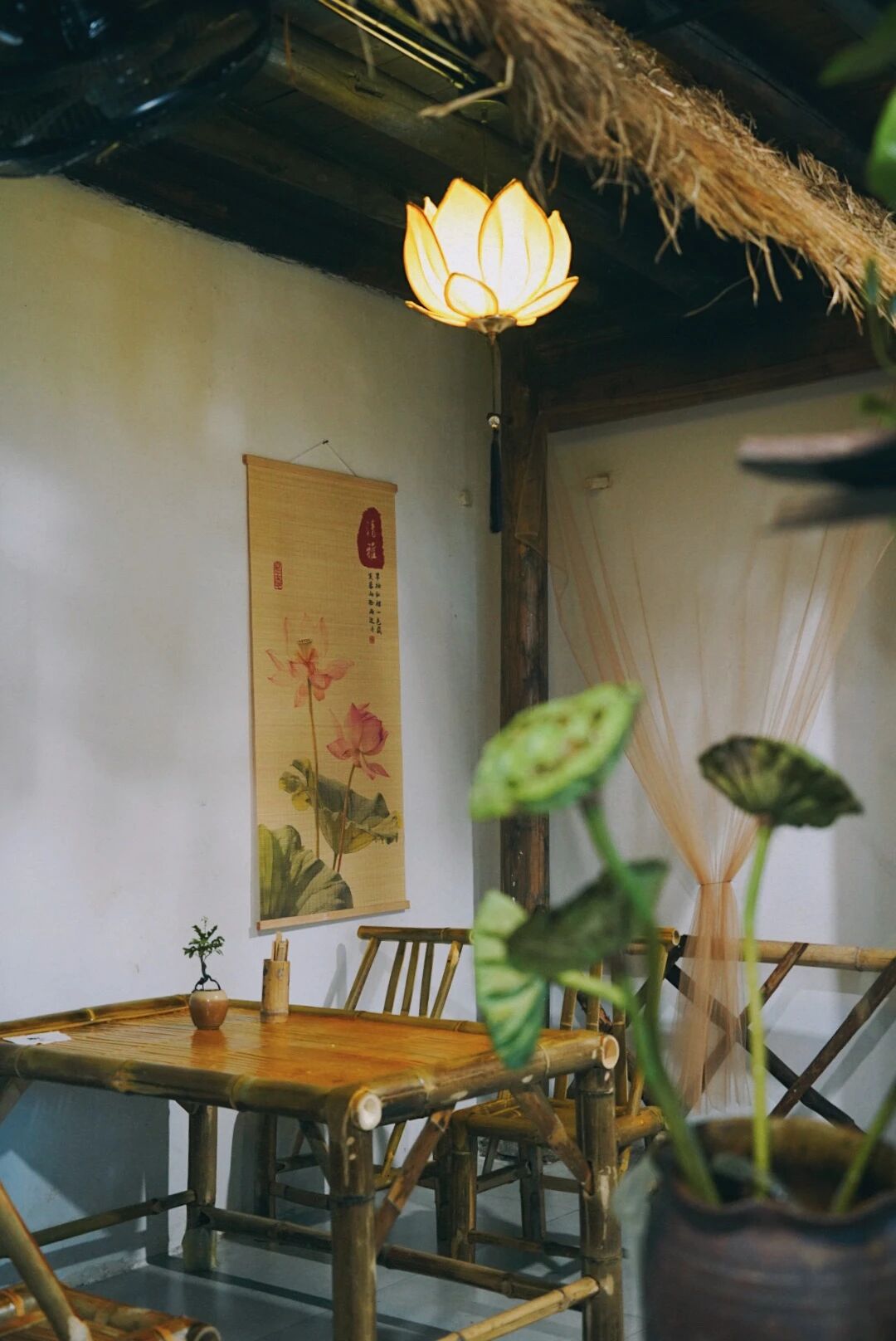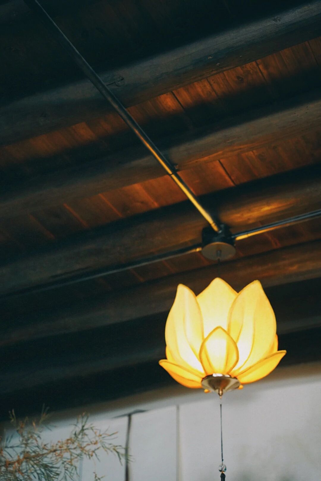 天花板上悬挂的莲花灯,灯盏做成了莲花形状,暖黄色的灯光透过灯罩洒下来,柔和温馨。