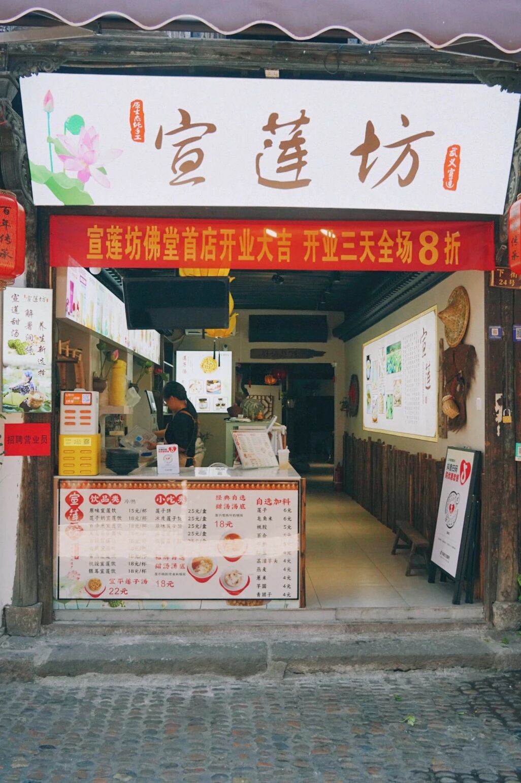 前不久,老街新开了一家「宣莲坊」,竹椅竹桌映着莲花灯影,清甜的莲子香顺着门帘飘出来……